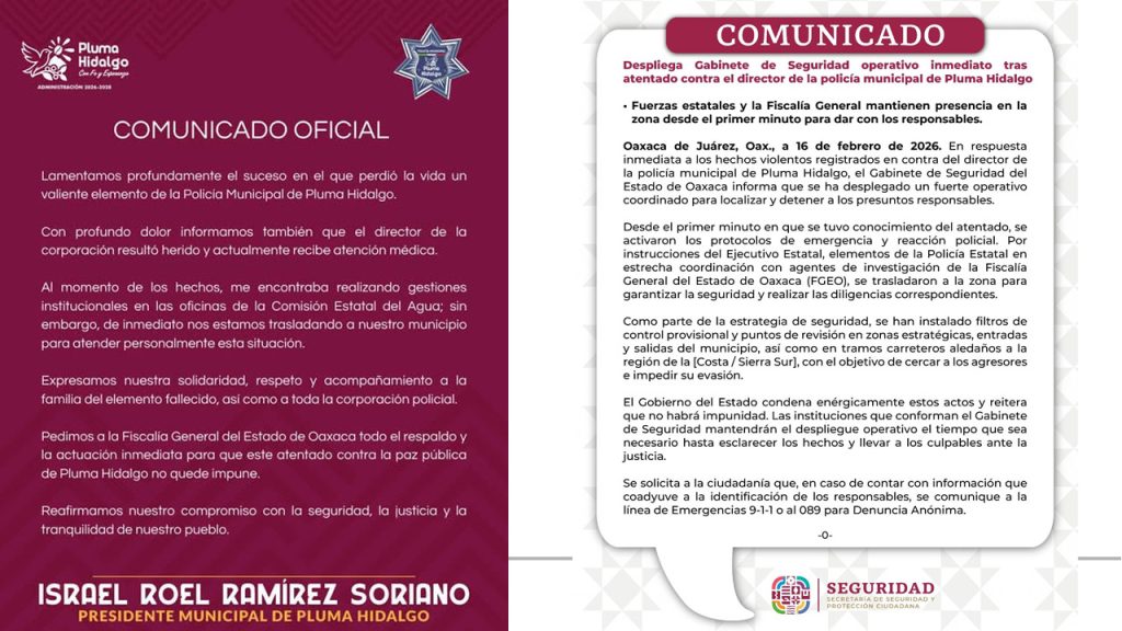 Horas más tarde, la Presidencia Municipal de Pluma Hidalgo confirmó, mediante un comunicado oficial, el fallecimiento de un elemento de la corporación. “Lamentamos profundamente el lamentable suceso en el que perdió la vida un valiente elemento de la Policía Municipal de Pluma Hidalgo”, señala el documento.
