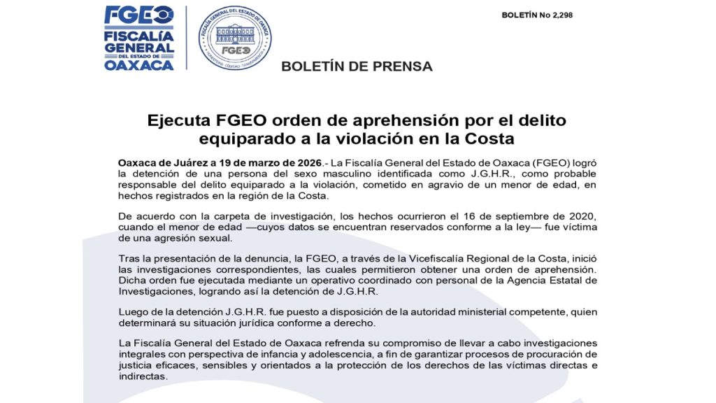Oaxaca de Juárez, Oax.– La Fiscalía General del Estado de Oaxaca informó sobre la ejecución de una orden de aprehensión en contra de un hombre identificado como J.G.H.R., señalado como probable responsable del delito equiparado a la violación en agravio de un menor de edad, en hechos ocurridos en la región de la Costa.