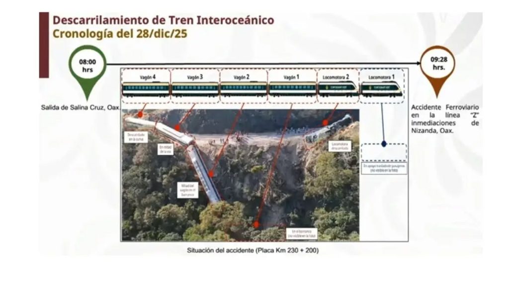 El accidente se registró alrededor de las 09:28 horas en la Línea Z, entre los poblados de Nizanda y Chivela, cuando una locomotora se salió de las vías y provocó que cuatro vagones descarrilaran, informó el almirante Raymundo Pedro Morales Ángeles en conferencia de prensa. Según el reporte oficial, a bordo viajaban aproximadamente 250 personas, de las cuales 109 fueron trasladadas a hospitales para su atención, y 44 permanecen internadas, muchas con lesiones de diversa gravedad.