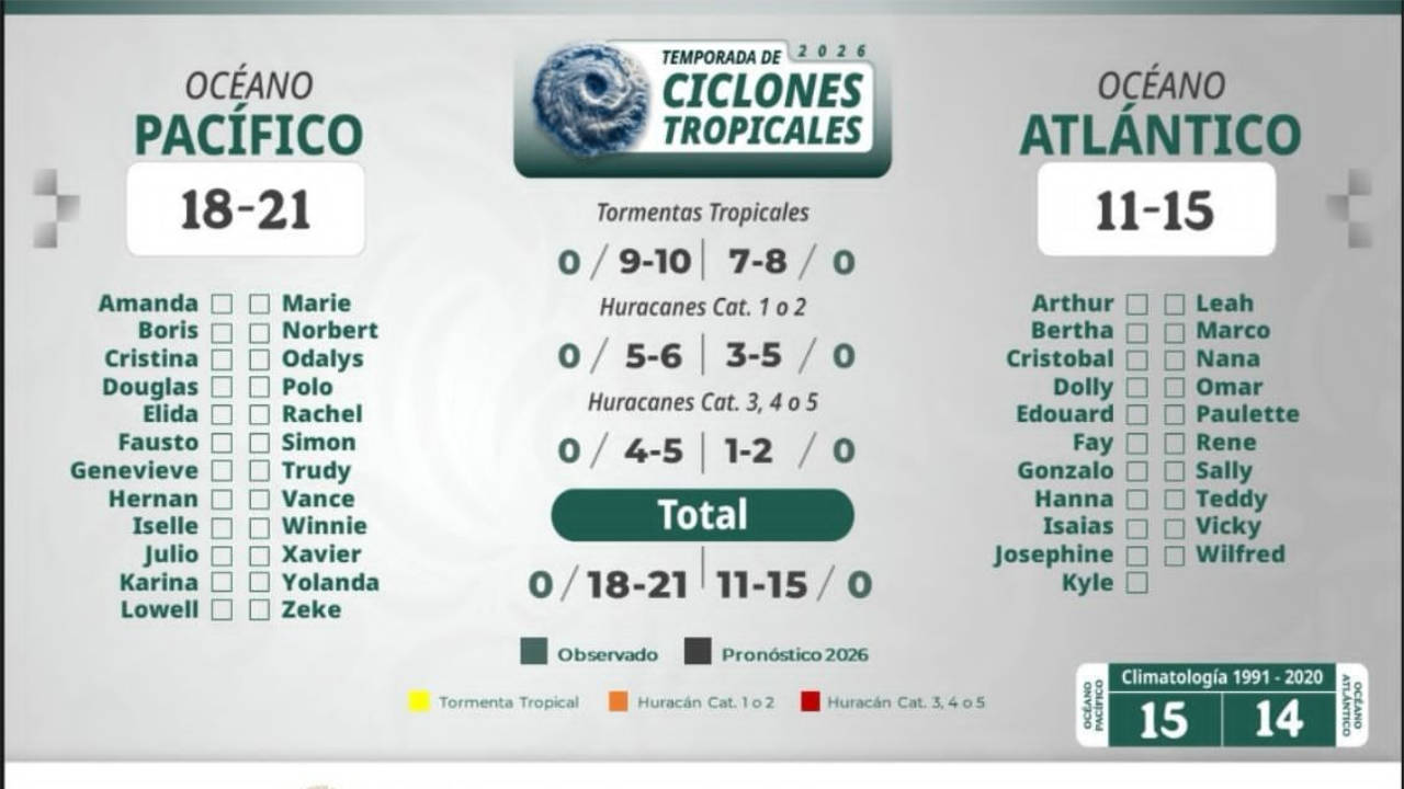 De acuerdo con la información preliminar, se prevé una temporada activa en ambos litorales. En el Océano Pacífico se estima la formación de entre 18 y 21 sistemas, recordando que la temporada inicia formalmente el 15 de mayo. Por su parte, en el Océano Atlántico, donde la actividad comienza el 1 de junio, se anticipa un incremento en la cantidad de ciclones respecto al promedio histórico, impulsado por condiciones climáticas específicas que favorecen su desarrollo.