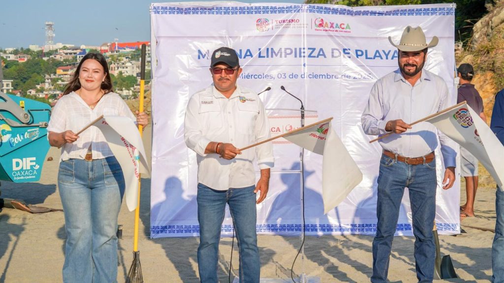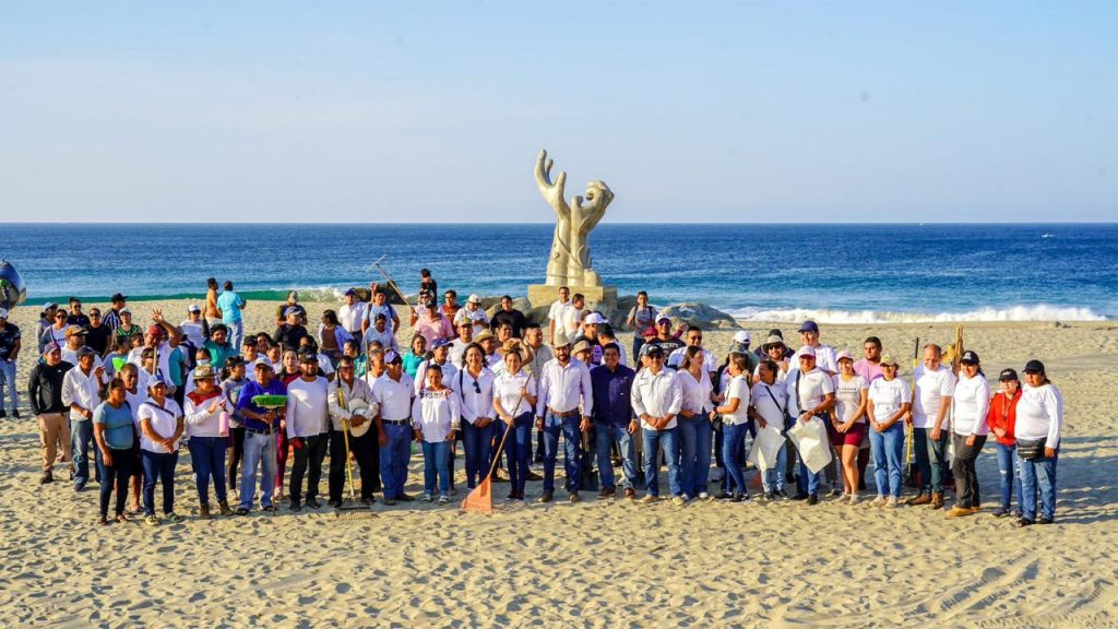 Puerto Escondido, Oax.– En un esfuerzo coordinado para fortalecer la imagen turística de la región y preservar el entorno natural, autoridades estatales y municipales participaron este martes en un mega tequio de limpieza de playas realizado de manera simultánea en nueve municipios de la Costa de Oaxaca. En Puerto Escondido, autoridades municipales de San Pedro Mixtepec y Santa María Colotepec dieron el banderazo en la playa Zicatela.