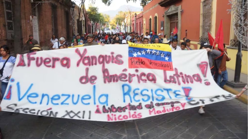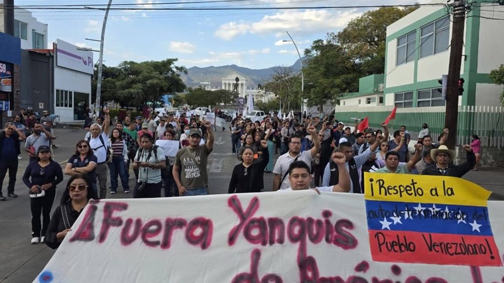 Oaxaca de Juárez, Oax. — Integrantes de la Sección 22 del Sindicato Nacional de Trabajadores de la Educación (SNTE) y diversas organizaciones sociales realizaron una marcha este sábado en la capital oaxaqueña para expresar su apoyo al pueblo venezolano y condenar la intervención militar de Estados Unidos en ese país.