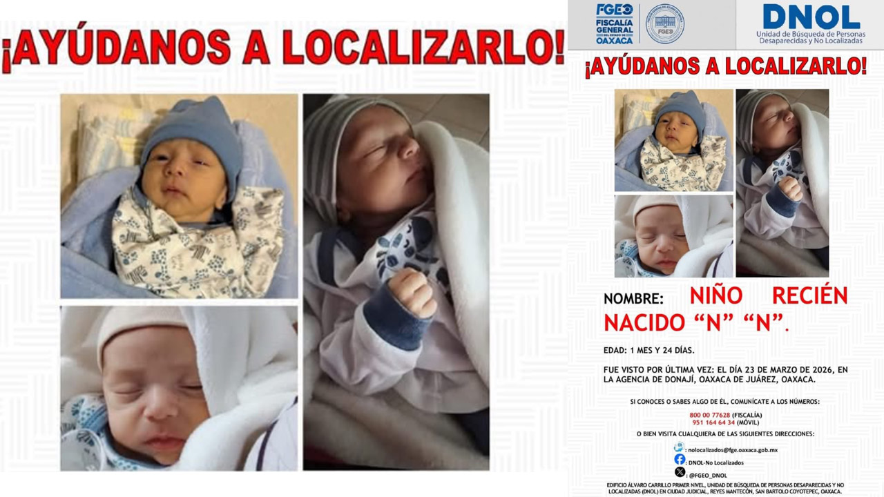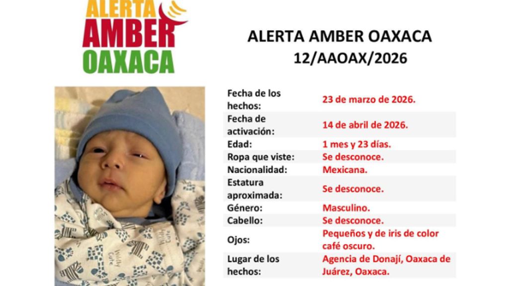 Oaxaca de Juárez, Oax.– Autoridades estatales activaron una Alerta Amber tras la desaparición de un bebé recién nacido identificado como “N.N.”, cuyo paradero se desconoce desde el pasado 23 de marzo en la Agencia de Donají, perteneciente al municipio de Oaxaca de Juárez.