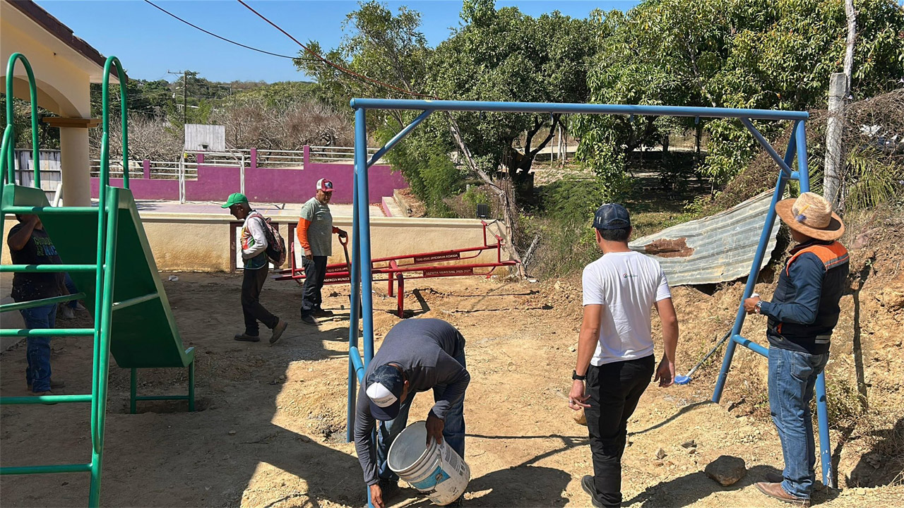 Durante los trabajos participaron el ingeniero Syndel, así como Erick, Cielo, Sadaham, Nabor, Rudy, Jorge y todo el equipo de la Agencia, quienes de manera organizada llevaron a cabo la colocación del equipamiento infantil. Las autoridades informaron que esta iniciativa continuará en los próximos días con la instalación de juegos en las colonias La Parota y Jardines, ampliando el beneficio a más familias de la comunidad.
