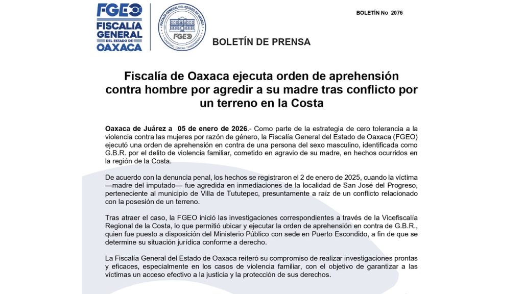 Oaxaca de Juárez, Oax. —En el marco de la estrategia de cero tolerancia a la violencia contra las mujeres por razón de género, la Fiscalía General del Estado de Oaxaca (FGEO) informó sobre la ejecución de una orden de aprehensión en contra de un hombre identificado con las iniciales G.B.R., señalado como probable responsable del delito de violencia familiar, cometido en agravio de su madre, en hechos ocurridos en la región de la Costa oaxaqueña.