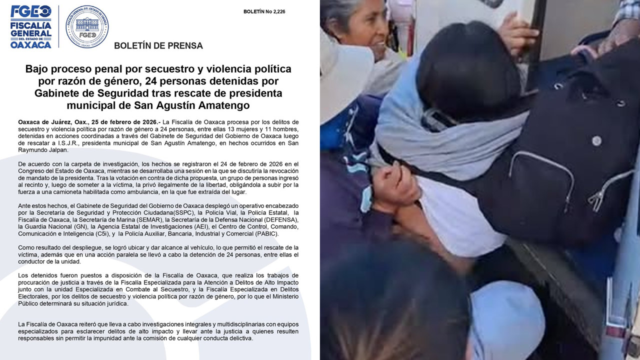 La Fiscalía General del Estado de Oaxaca inició proceso penal contra 24 personas por los delitos de secuestro y violencia política por razón de género, luego de que fuera rescatada la presidenta municipal de San Agustín Amatengo, I.S.J.R., tras su privación ilegal de la libertad en el Congreso del Estado.