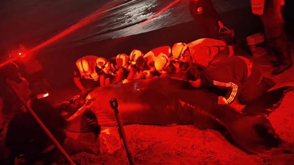 Bahías de Huatulco, Oax. – Una cría de ballena que encalló en las inmediaciones del Campamento Tortuguero de Barra de La Cruz, en el municipio de Santiago Astata, fue rescatada con éxito gracias a un esfuerzo coordinado entre autoridades, personal especializado y habitantes de la zona. El hecho ocurrió la noche de este sábado y activó de inmediato los protocolos de atención a fauna marina en situación de riesgo.