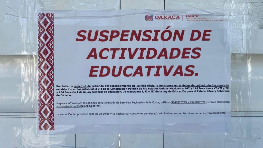 El Instituto Estatal de Educación Pública de Oaxaca (IEEPO) colocó la tarde de este día sellos de “Suspensión de Actividades Educativas” en las instalaciones del Instituto México de Huatulco, ubicado en el destino turístico de Huatulco.