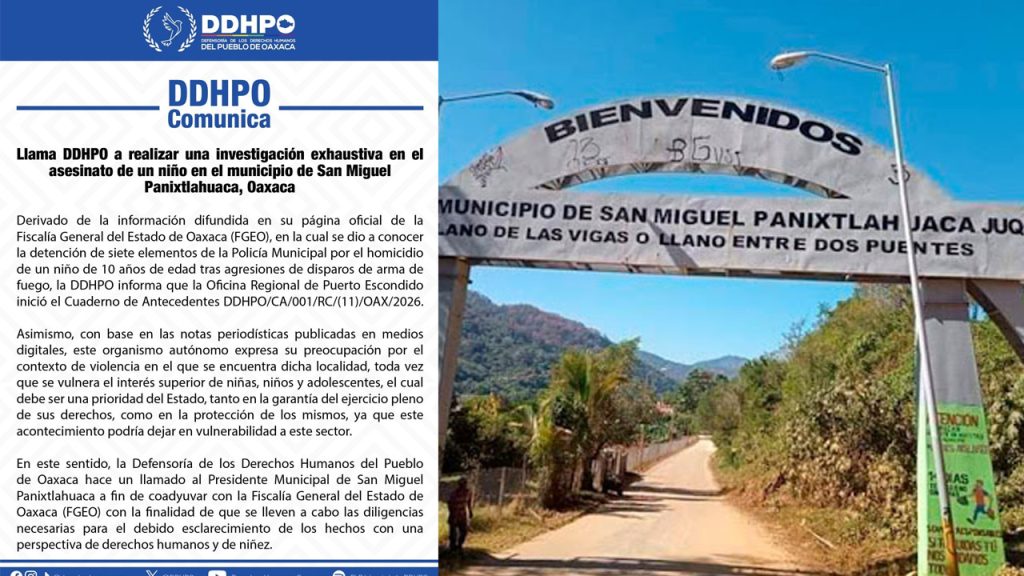 La Defensoría de los Derechos Humanos del Pueblo de Oaxaca (DDHPO) hizo un llamado a las autoridades competentes para que se realice una investigación exhaustiva y con enfoque de derechos humanos en el caso del asesinato de un niño de 10 años de edad ocurrido en el municipio de San Miguel Panixtlahuaca, en la región de la Costa.