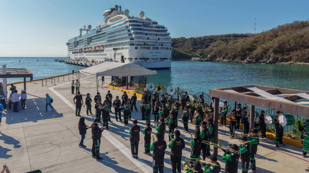El puerto de Santa Cruz Huatulco recibió este día al crucero Coral Princess, correspondiente al arribo número 14 de la temporada 2025–2026 y el cuarto del mes, marcando además uno de los primeros atraques del año 2026 en este destino turístico de Oaxaca.