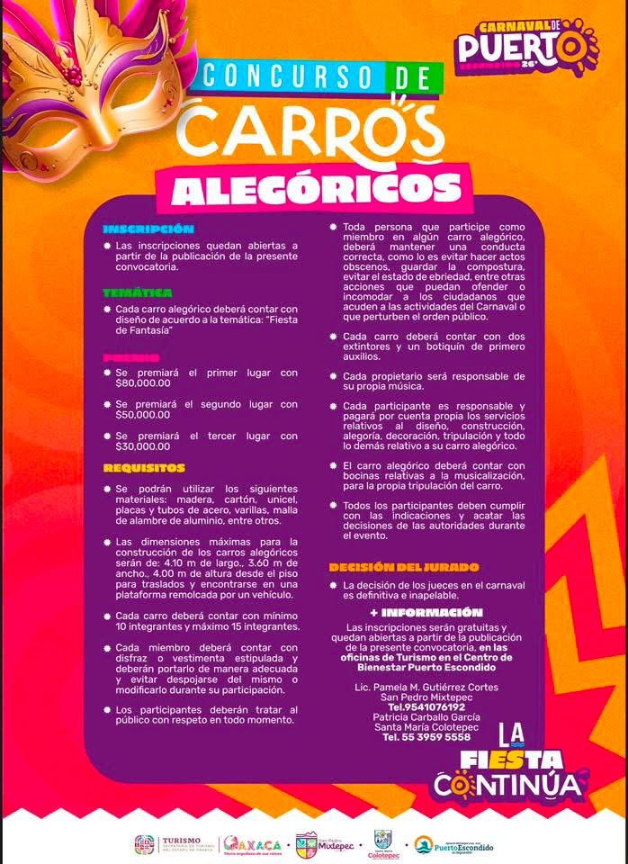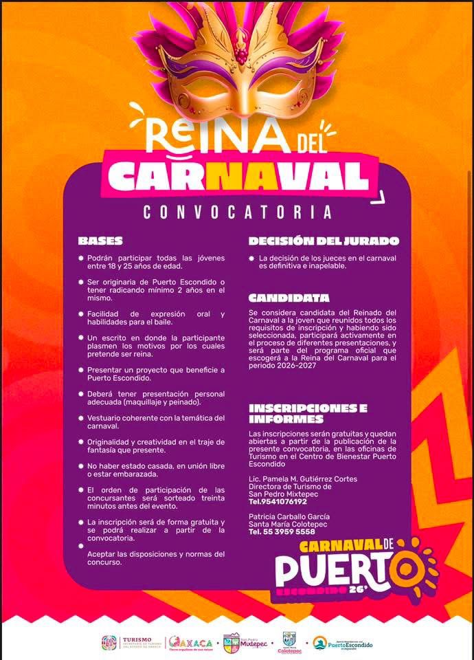 Para quienes deseen integrarse al desfile, se han establecido bases de participación que deberán ser consultadas previamente, con el objetivo de garantizar el orden, la seguridad y el desarrollo adecuado del evento. La convocatoria está abierta a colectivos, escuelas, organizaciones y público en general que desee contribuir con propuestas creativas que enaltezcan la cultura, la tradición y el espíritu festivo de Puerto Escondido.